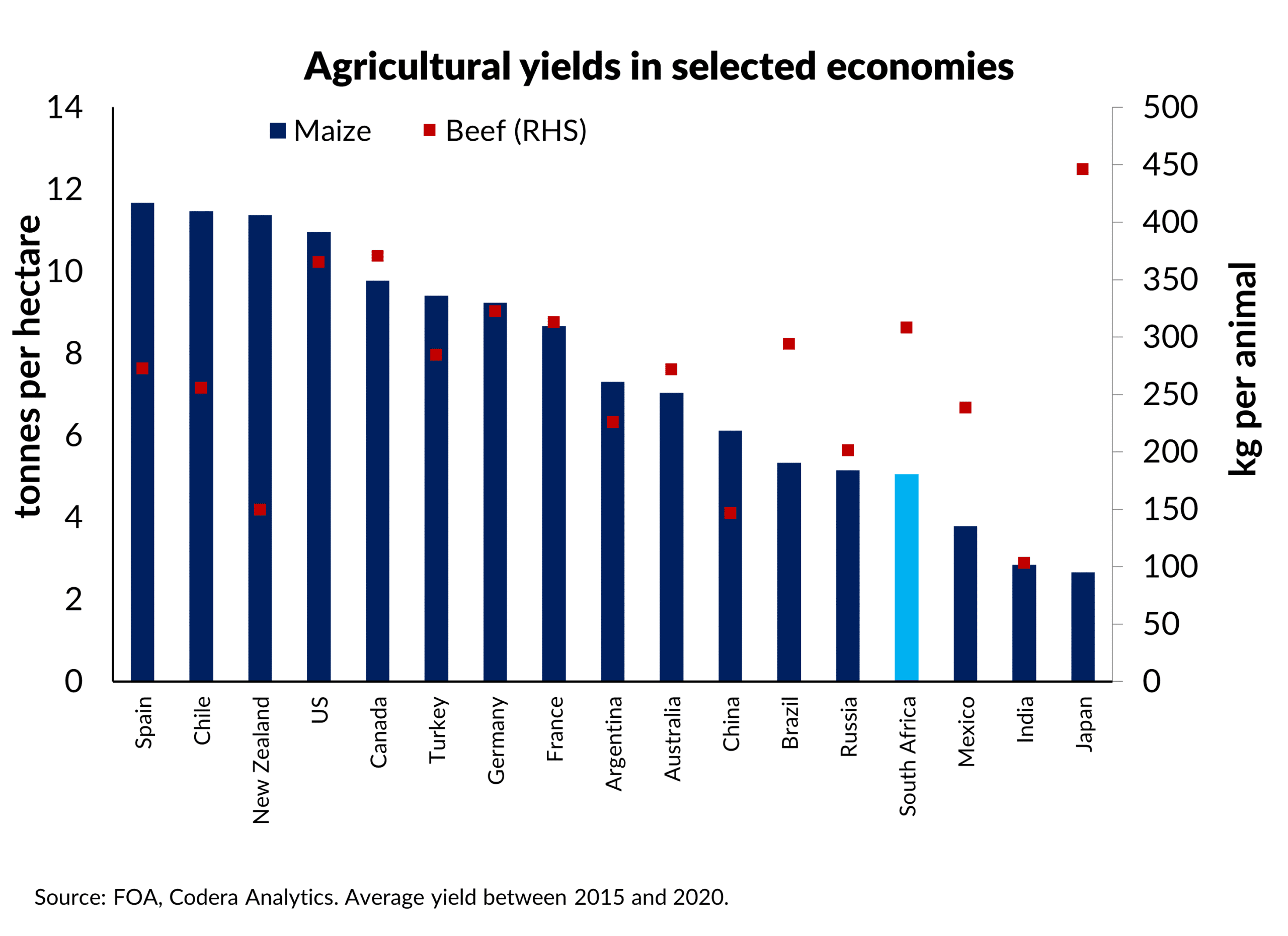 South African maize yields are lower than in other major maize producers, but our beef yields compare more favourably to major beef producing economies.