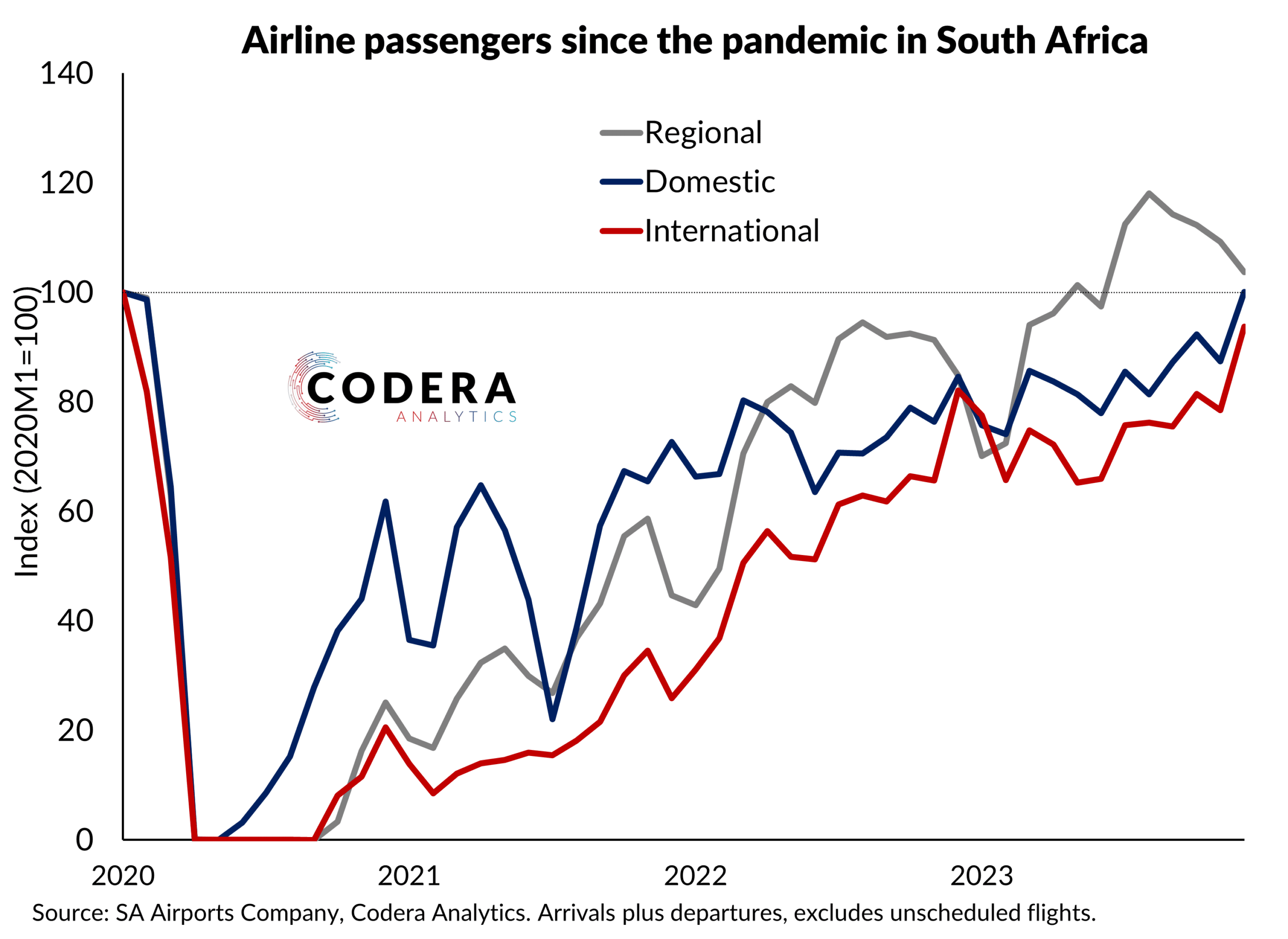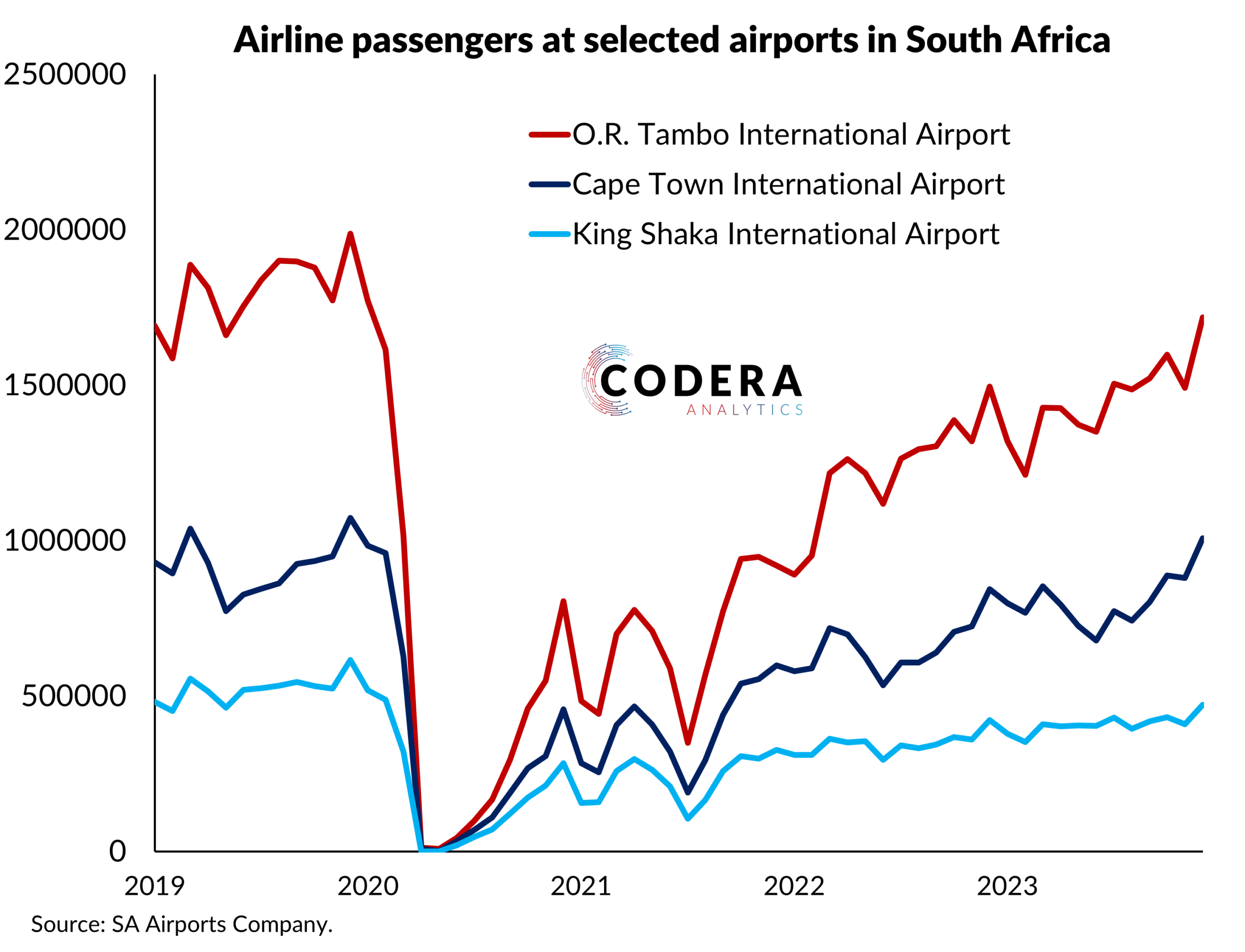 Domestic and regional flight passenger numbers have recovered since the pandemic and international flight passenger numbers were almost back to pre-pandemic levels in December 2023. Passenger numbers through O.R. Thambo totaled 1.7 million in December 2023, compared to just below 1.5 million in December 2022. Cape Town International saw arrivals and departures totaling over a million passengers in December, compared to about 850 000 in that month the previous year.