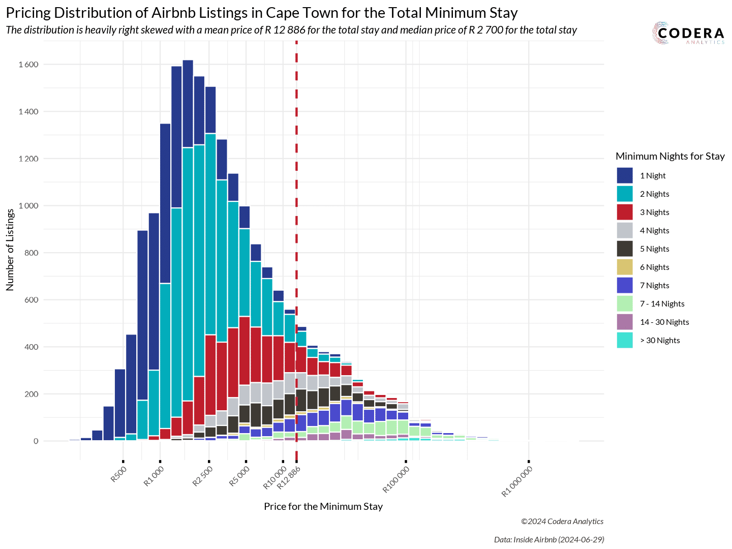 In an earlier post we showed that the distribution Airbnb rates in Cape Town is skewed to the right. Today’s post shows the distribution of total prices, distinguishing between different minimum stay requirements. The right skew reflects high minimum stay requirements for expensive rentals. The most expensive listing costs an incredible R1 260 000 for a 7 day stay.