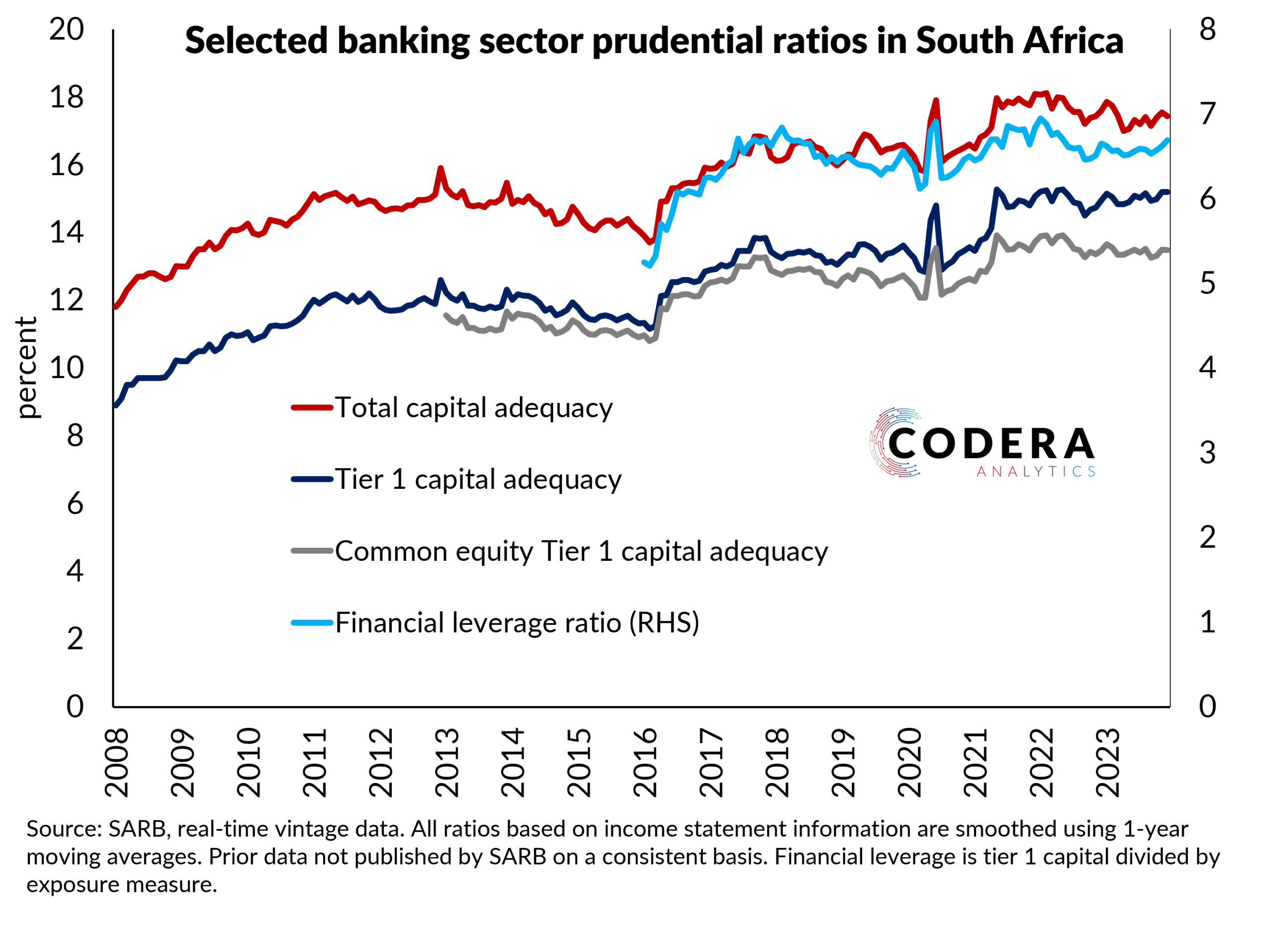 South African bank prudential capital ratios have been quite stable over the last three years. Detailed data describing capital buffers are not published by the regulator in South Africa, but our proxies suggest that excess capital buffers held by banks began to decline in 2023. These ratios were generally near historical highs before turning down, so they do not necessarily imply an increase in banking system vulnerability to market instability. But this could be a signal that banks may become more risk-averse and more likely to reduce their lending activities.