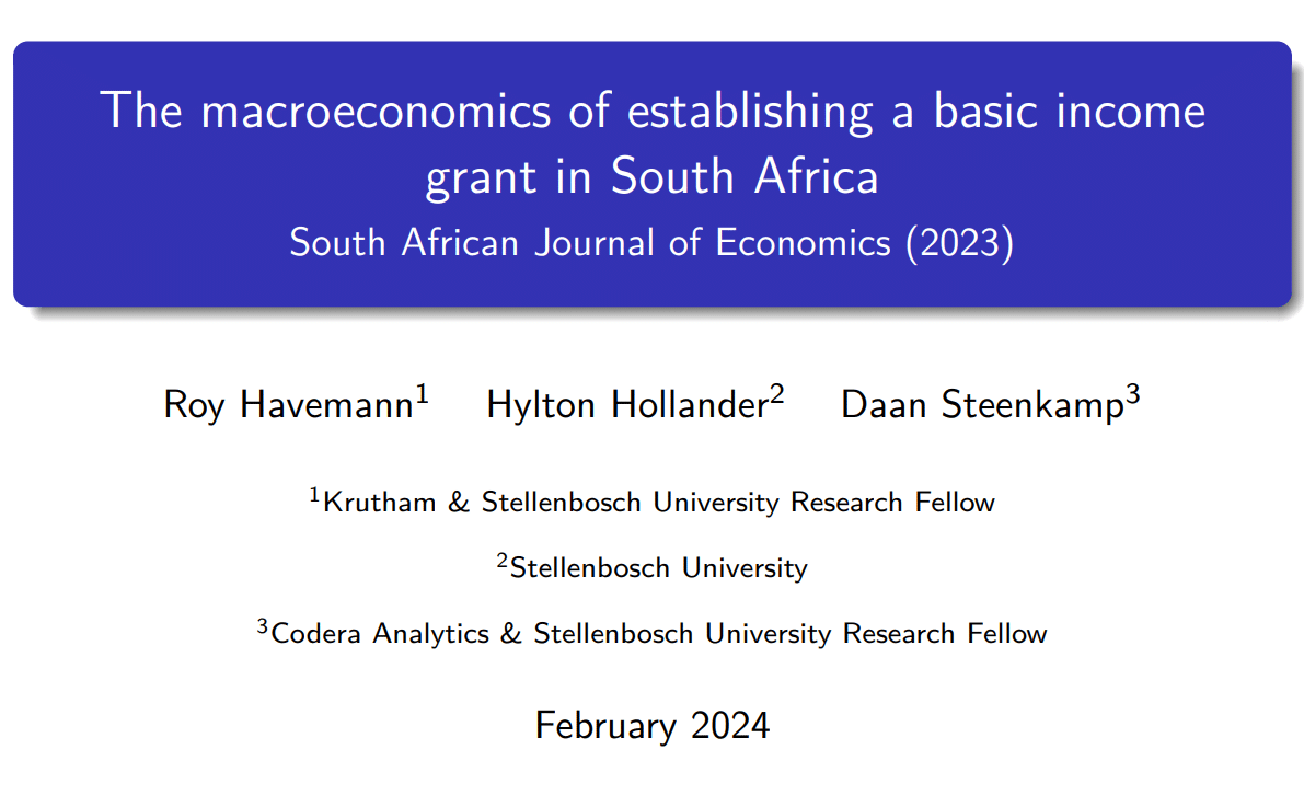 There have recently been calls on government to extend social relief of distress grants or to institute a basic income grant. These slides summarise our SA Journal of Economics paper that quantifies the costs and benefits of expanding social transfers in South Africa: The macroeconomics of establishing a basic income grant in South Africa. You can also access the paper here (open access).