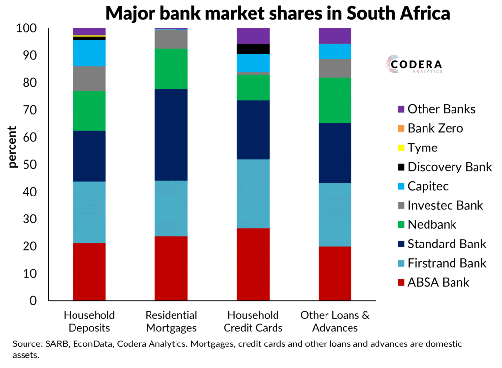 Today’s post assesses the extent to which new banks have gained market share in South Africa’s banking sector. New bank entrants have gained large numbers of customers in South Africa: Tyme Bank is reported to have gained almost 10 million accounts and Discovery Bank reportedly has over 2 million customers. However, market share gains for these banks have been much more modest when considering bank deposits and credit products.