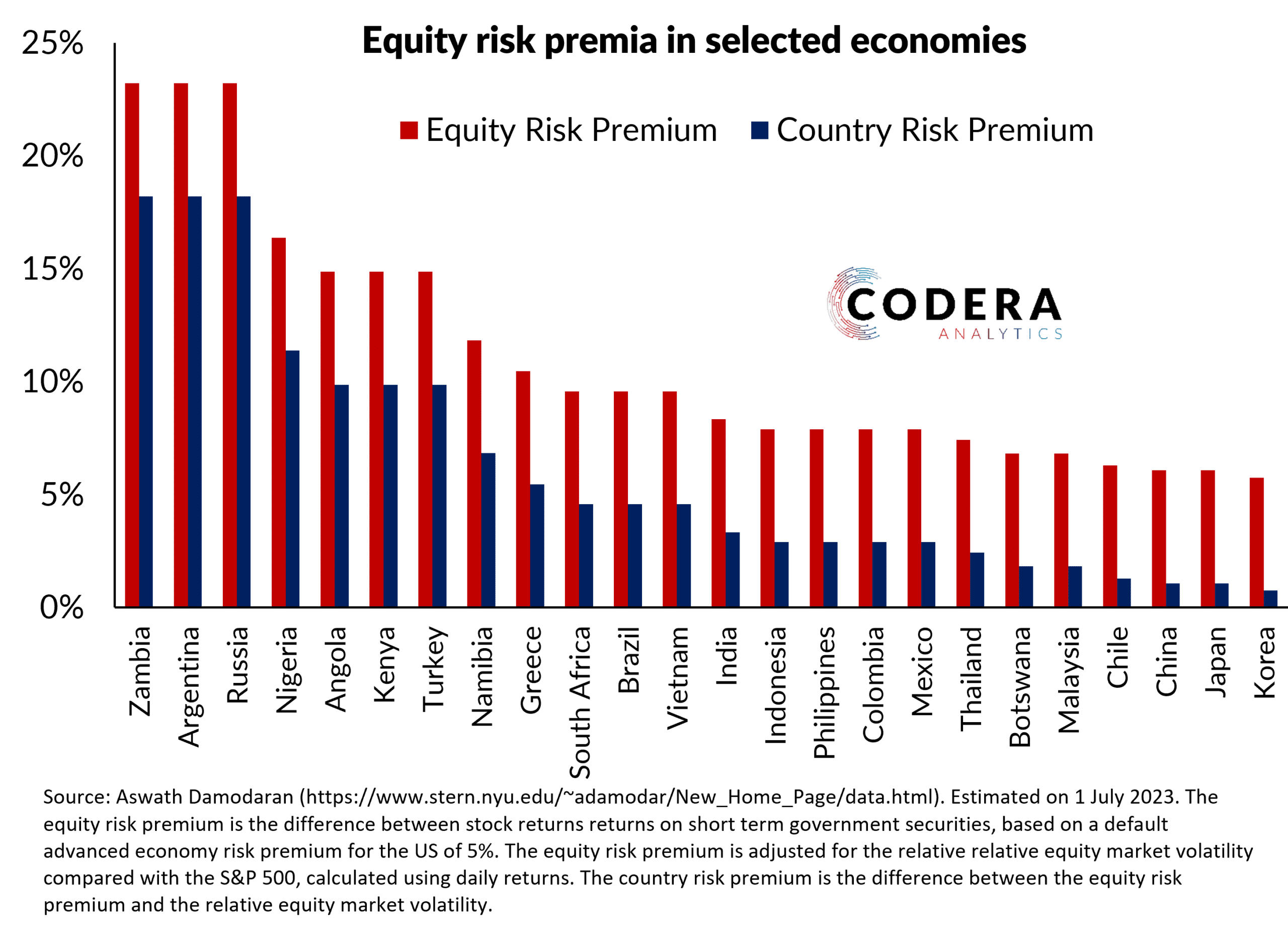 The equity risk premium captures the price of risk in equity investment – it is the excess return for investing in stocks instead of risk free investments. Estimates from Aswath Damodaran suggests that the South African equity risk premium has risen by almost 4 percentage points since 2021 to around 9.5%, comparable to Greece and Brazil. Note that these are controversial estimates given how high they are and there are many alternative ways to measure equity premia, see here and here for alternatives.