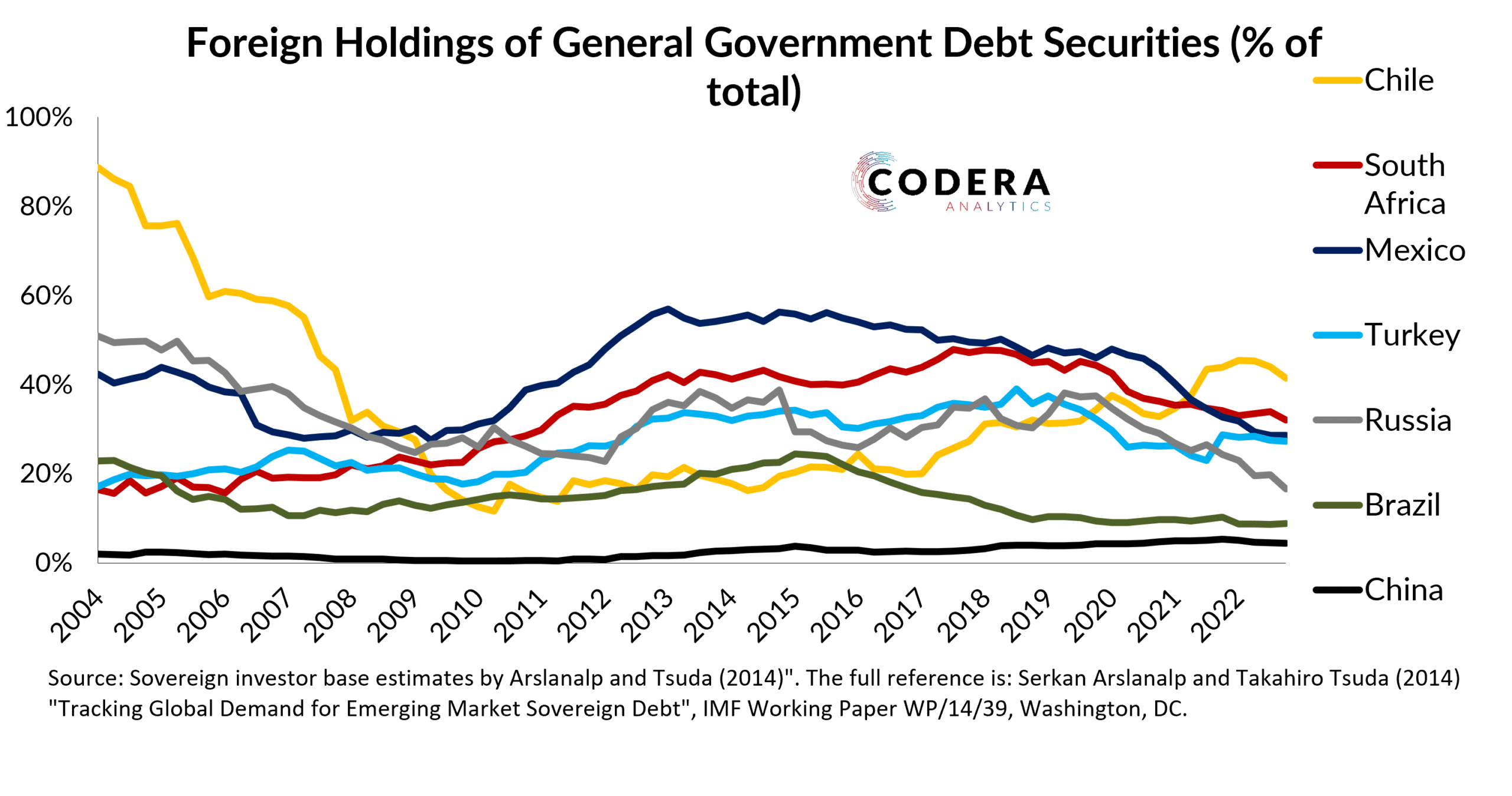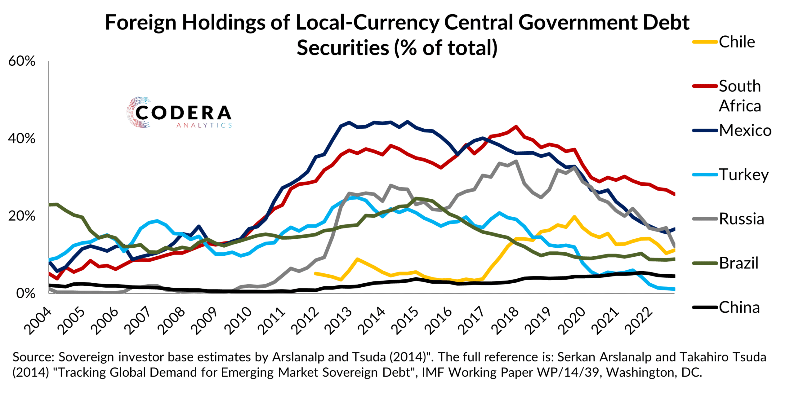 Foreign holdings of government debt has declined for emerging market economies such as South Africa, Mexico and Russia over recent years. By comparison to major emerging market economies, South Africa continues to have a high share of foreign holders of local currency debt, however.