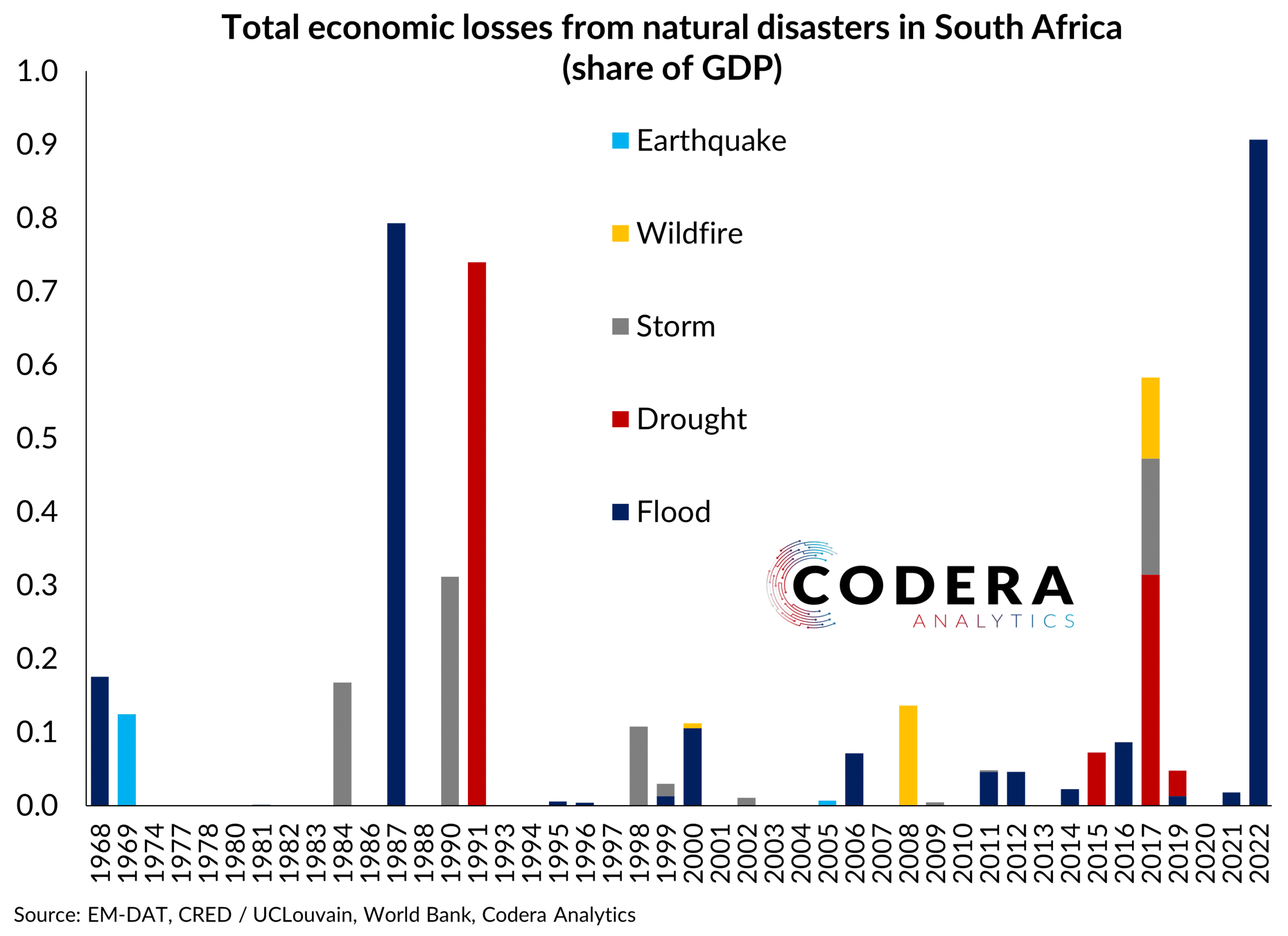 Droughts are not very common, but they have involved large economic losses relative to other more common natural disasters like floods. Today’s post shows the economic losses from natural disasters in South Africa since the late 1960s, which are dominated by floods.