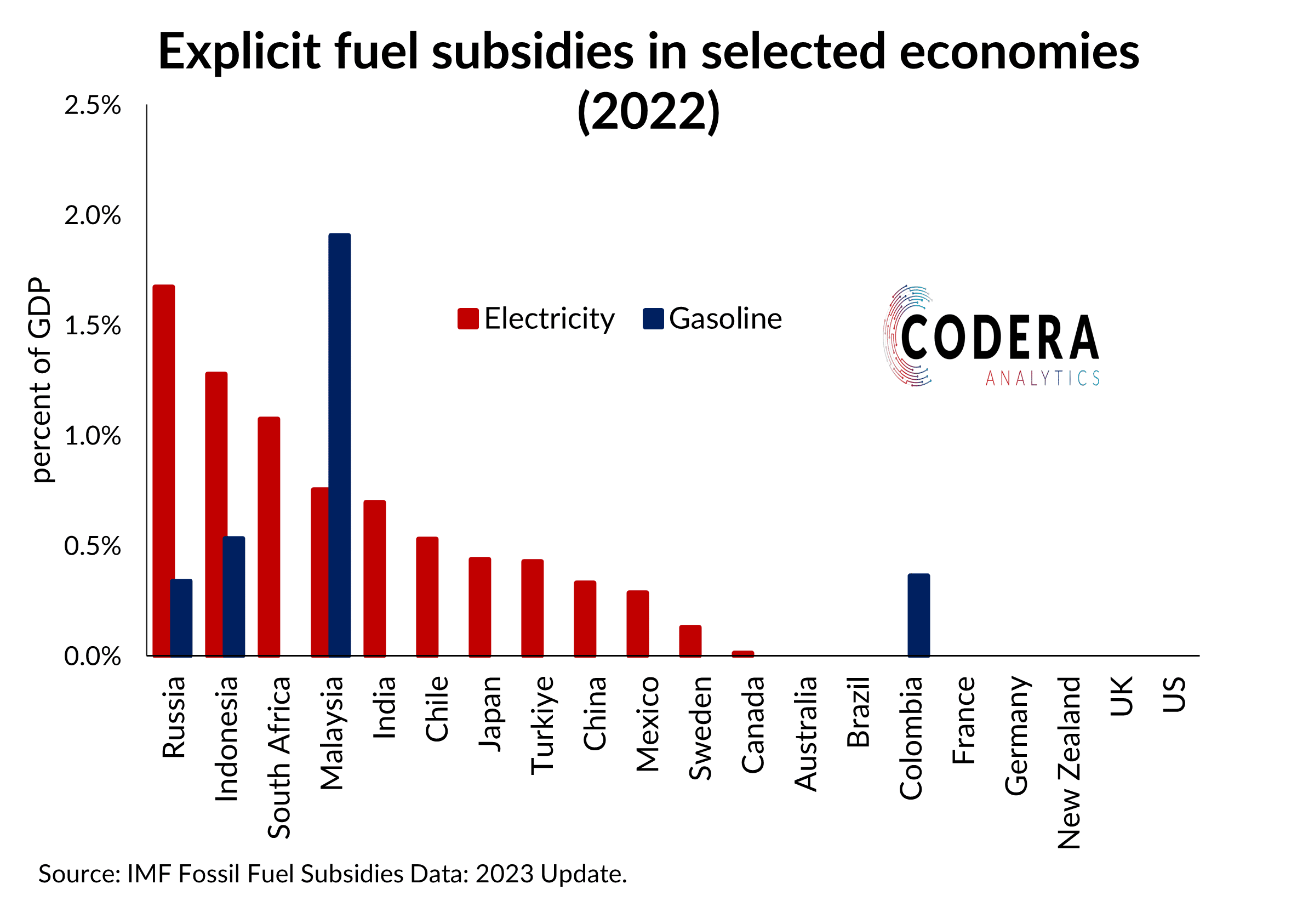 While there are relatively few major economies that provide explicit subsidies for gasoline (having lower prices than supply costs ), there are several that provide subsidies for electricity. IMF estimates suggest that Russia spent over 1.5% of GDP on electricity subsidies in 2022, while Malaysia spent almost 2% of GDP on gasoline subsidies. South Africa spent over 1% of GDP on electricity subsidies according to IMF estimates.