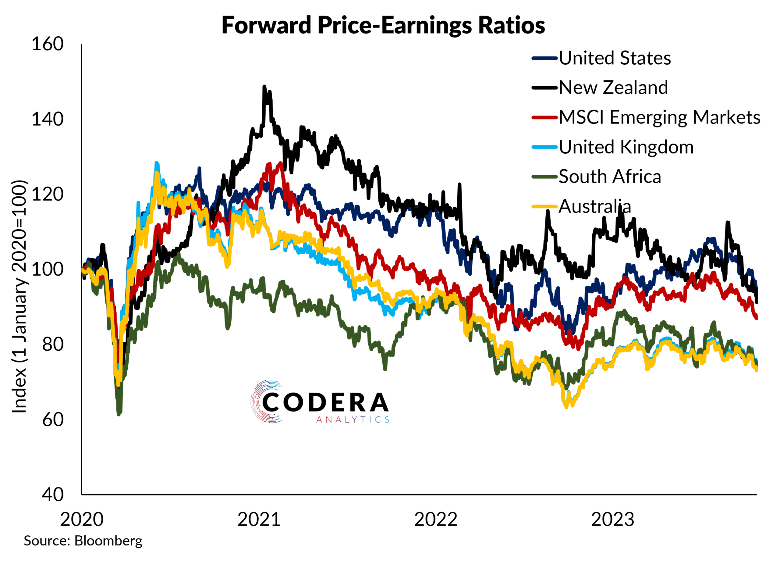 Relative forward price earnings have been moving against South African stocks over the last several years. Since the pandemic, market expectations of future corporate earnings potential have weakened in many major economies.