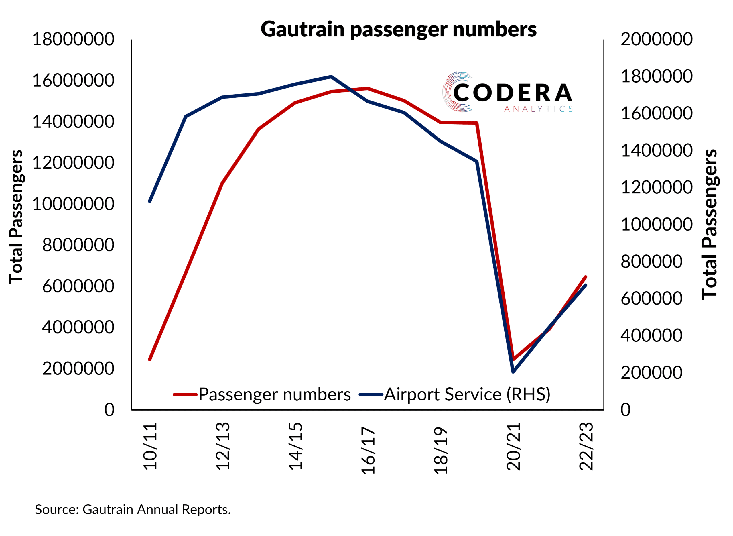 Gautrain passenger numbers in financial year 22/23 were still down more than 50% compared to the financial year 19/20.