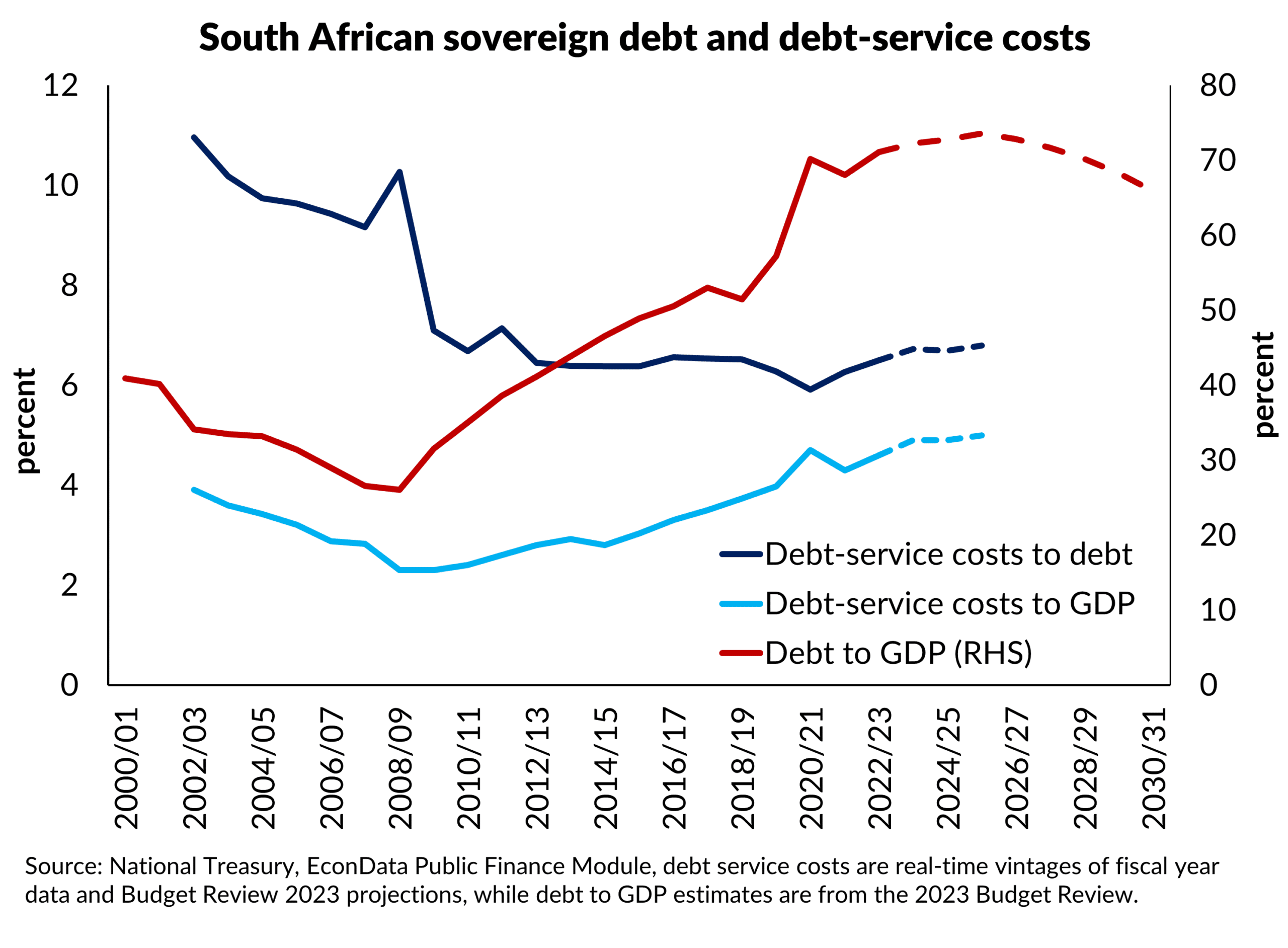 South Africa’s government debt has steadily climbed since the global financial crisis (GFC). After falling as a result of low global interest rates, government’s debt service costs have been rising on account of growing public debt, nearly doubling as a percentage of GDP since the GFC.