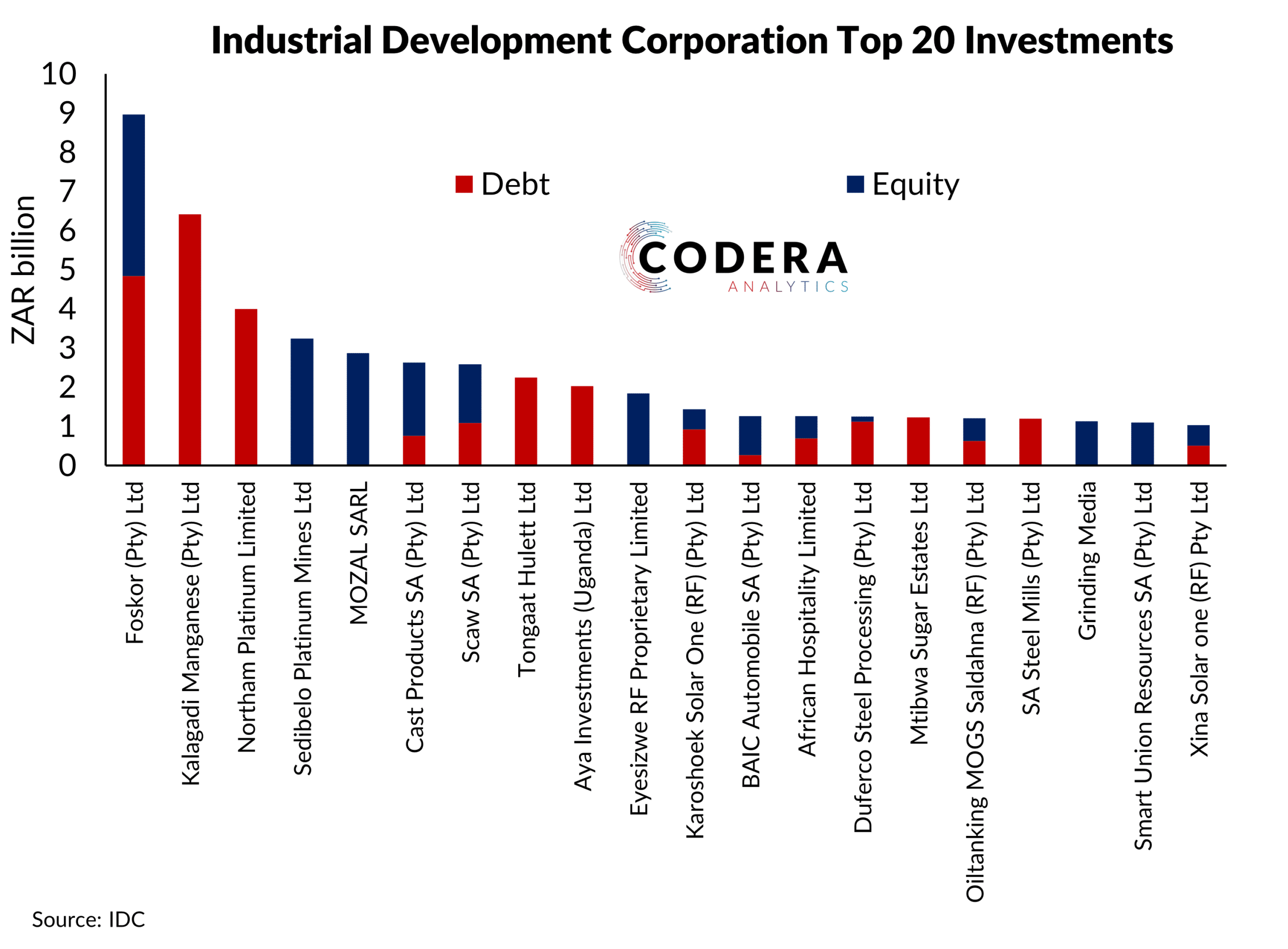 Which are the largest financial exposures of the South African government-funded Industrial Development Corporation (IDC)? Its total investment portfolio exceeds R100 billion, with around half of this figure reflecting investments in 20 companies. The largest of these investments includes Foskor (supplier of granular fertilisers), Kalagadi Manganese (mining company) and Northam Platinum (mining company).