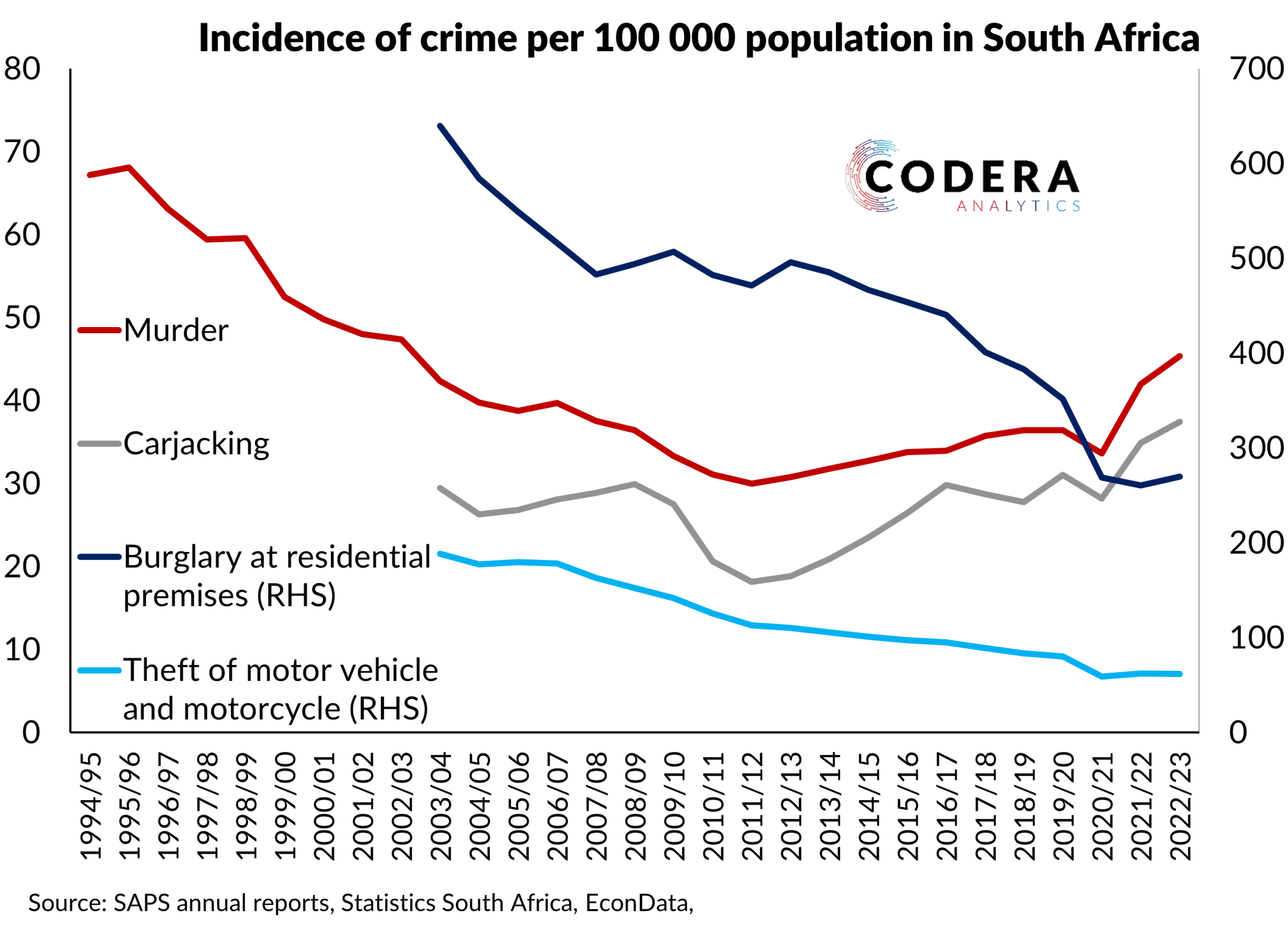 After a decline in the incidence of several categories of crimes since the early 2000s, there has been recent increase in crimes such as murders and carjacking. Conviction rates are low in South Africa (see here for a comparison across countries).