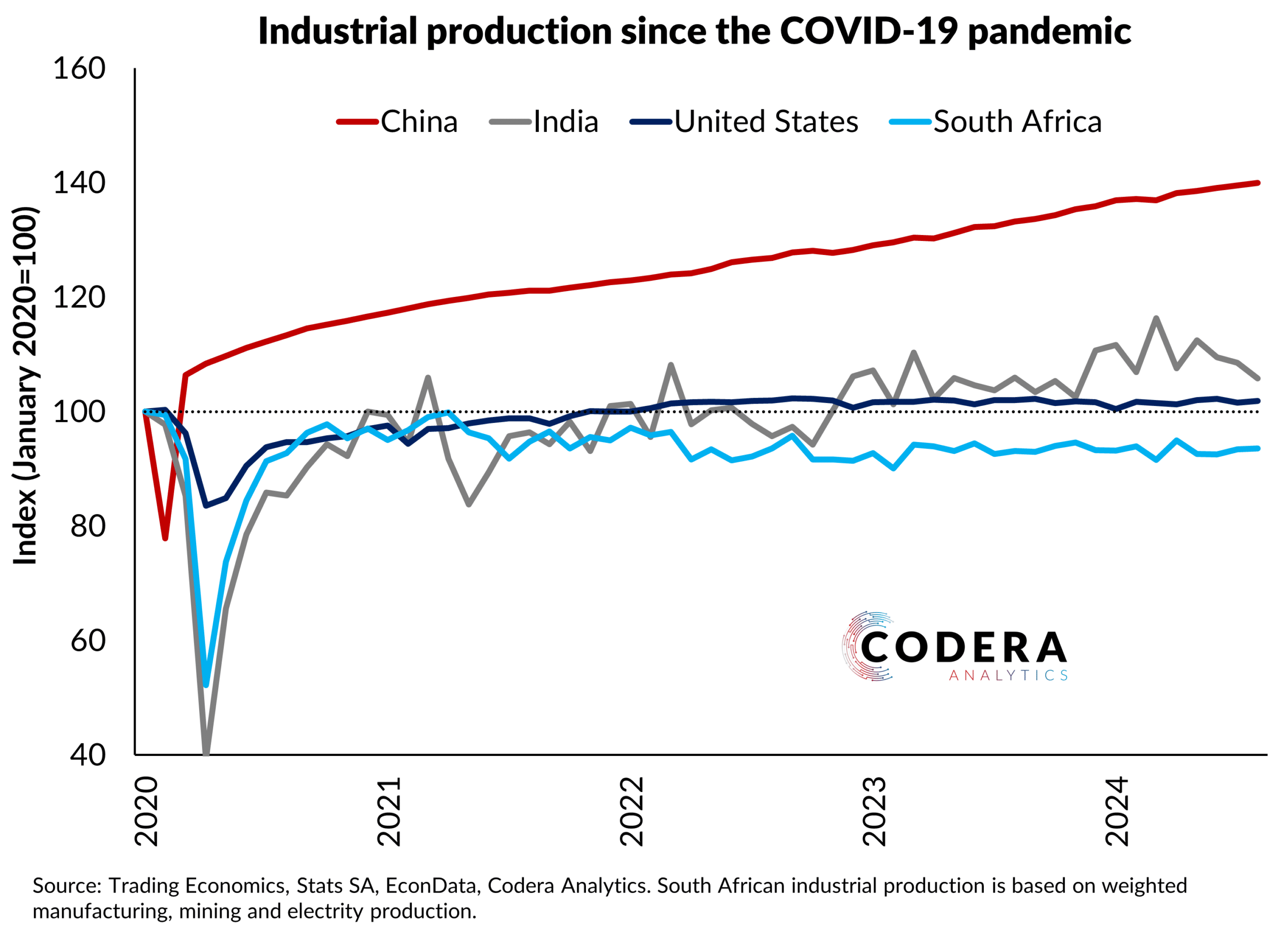 South African industrial production is still down on its pre-COVID pandemic level, whereas it has recovered in the US and India, and grown strongly in China.