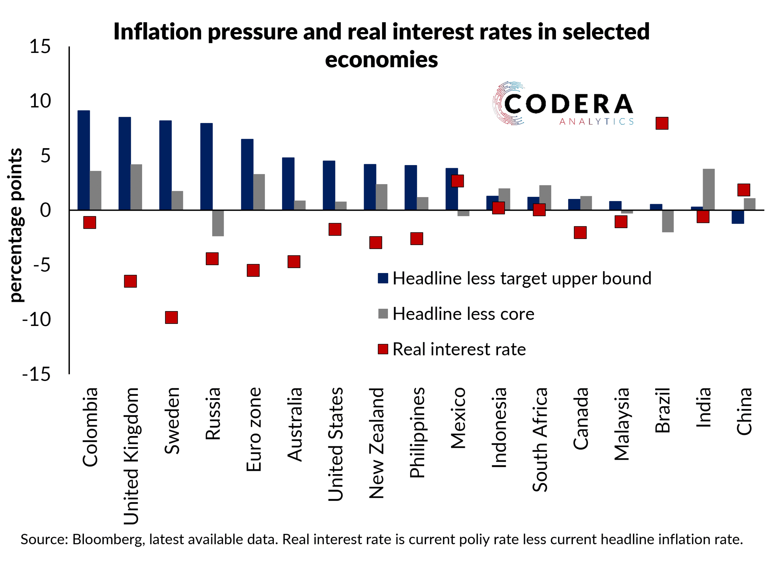 Policy rates are still below current levels of inflation in countries where deviations in headline inflation from targets are large.