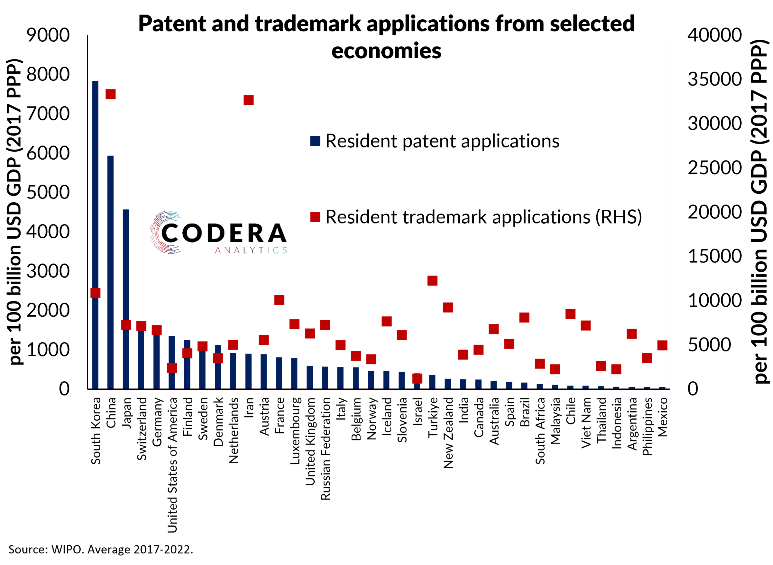 Relative to the size of their economy, South Korea, China and Japan stand out for their level of patent applications, while China, Iran and Turkey stand out for their high relative level of trademark applications over the last 5 years.