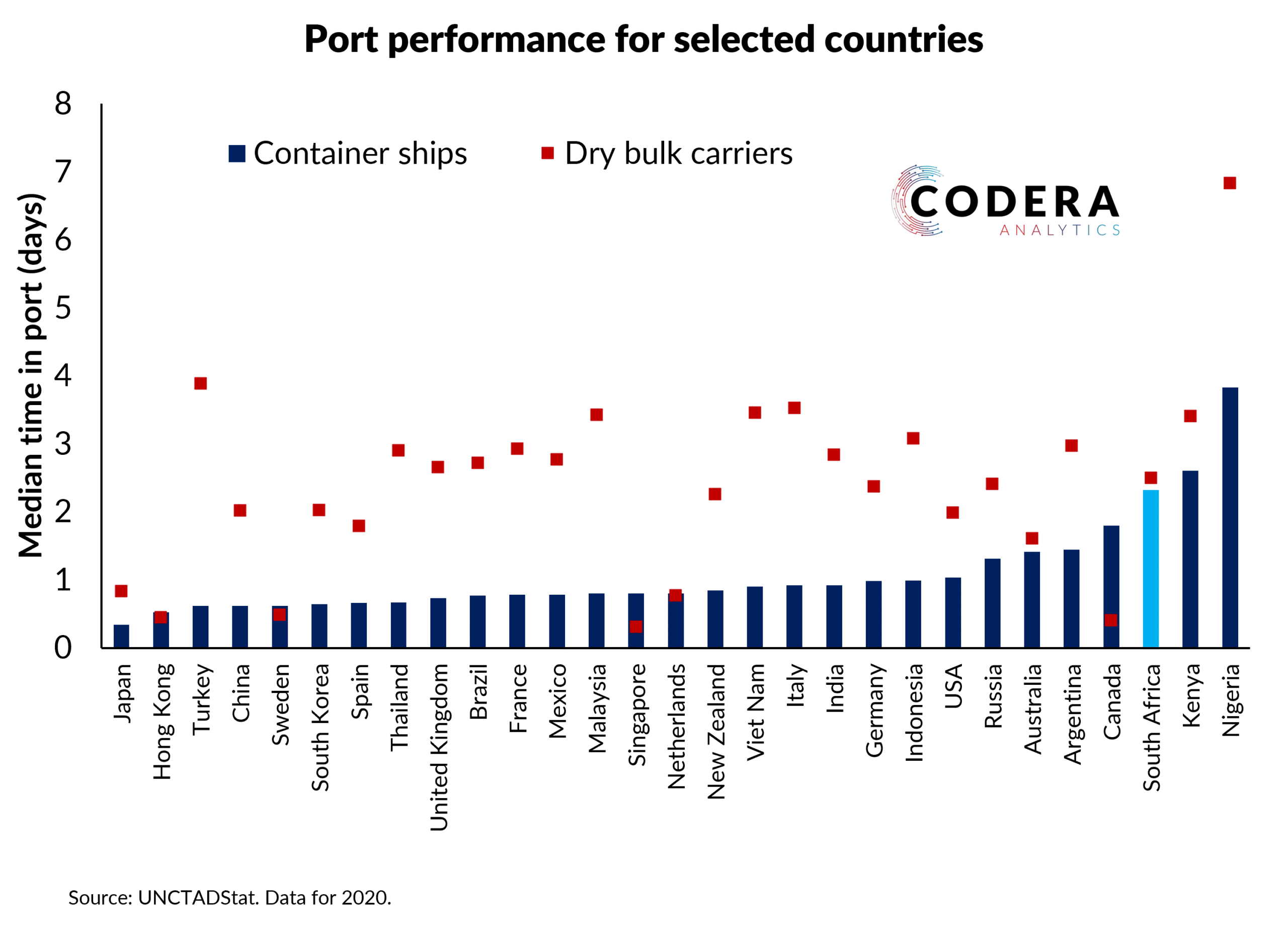 South African ports stand out internationally for their low efficiency, according to port performance data from UNCTAD. A 2020 study by the World Bank ranked South African ports right at the bottom of their list of best performing ports. They ranked Port of Cape Town 347th, Port Elizabeth 348th, Durban 349th, and Ngqura 351th out of the 351 global ports considered.