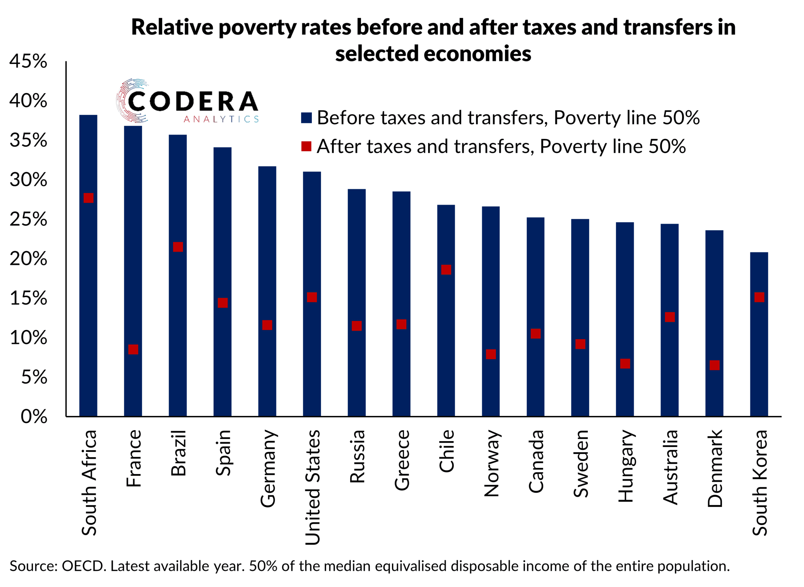 Among major economies, South Africa stands out for the high proportion of households that are at risk of low incomes and the low extent to which taxes and transfers reduce this proportion. While the most recent available estimates for most countries is 2021, for South Africa the latest estimates are for 2017. The estimates suggests that despite relatively progressive fiscal policy in South Africa, the incidence of policy may not be strongest on the poorest in society. One would expect that the social relief of distress grants implemented since the COVID pandemic likely helped to reduce poverty, but there is some debate about the efficacy of the policy.