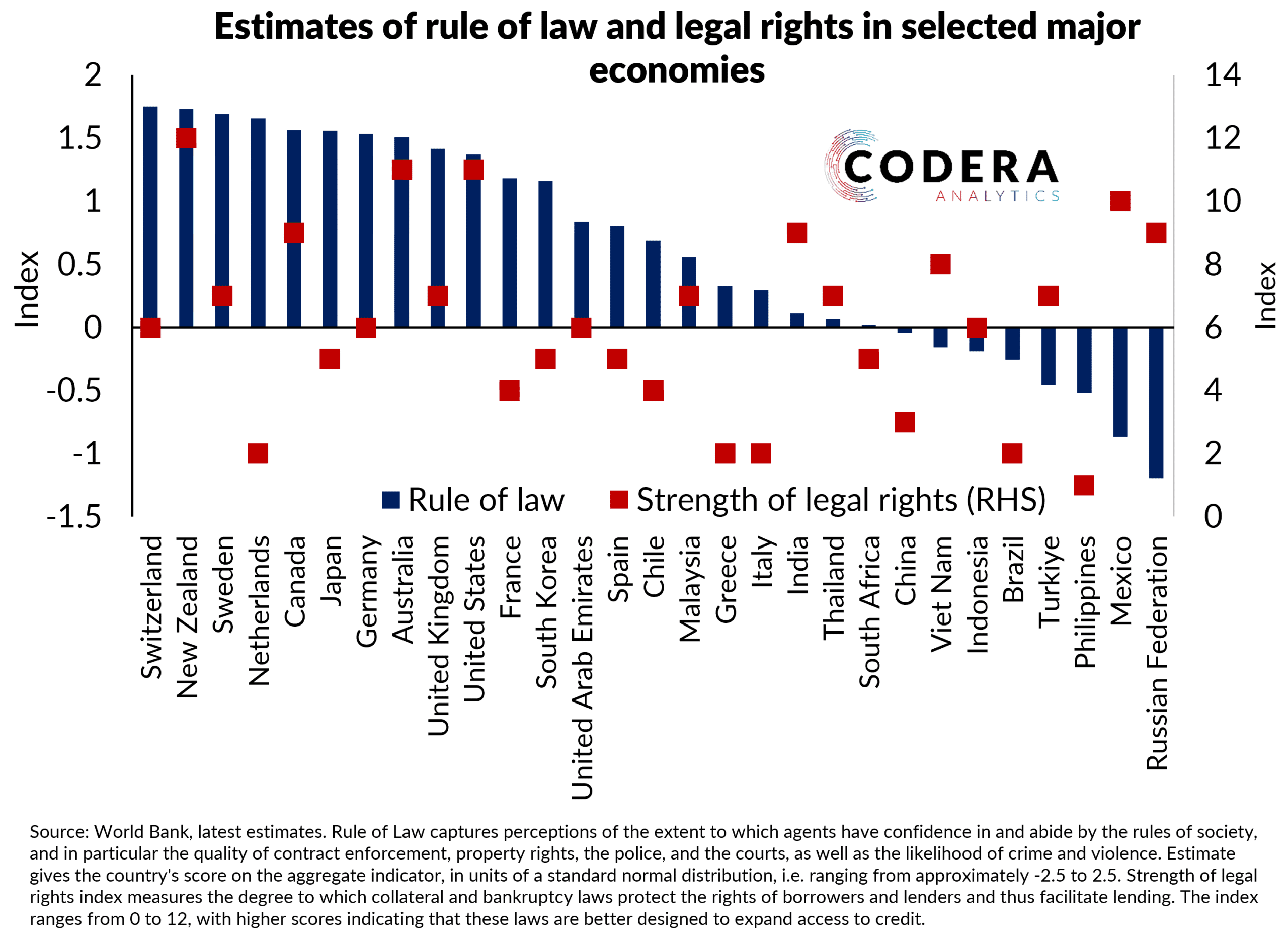 The World Bank assess countries such as Switzerland, New Zealand, Sweden and the Netherlands to have the strongest rule of law among major economies and New Zealand, Australia and the United States to have the strongest legal rights.