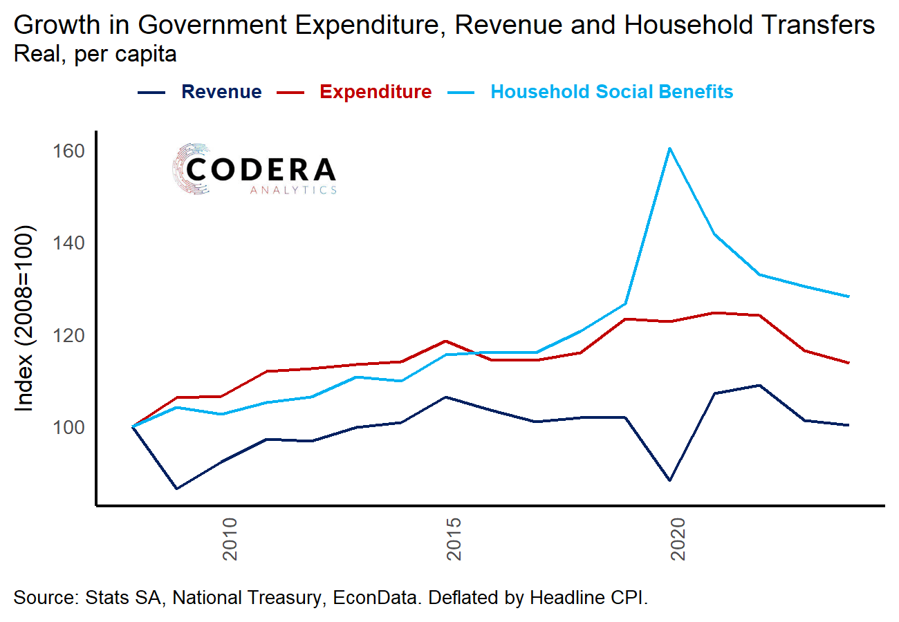 action or later. Please see Debugging in WordPress for more information. (This message was added in version 6.7.0.) in /home/coderaco/domains/randomsample.co.za/public_html/wp-includes/functions.php on line 6121While South African tax revenues have growth in line with inflation on a per capita basis, government expenditure and social grants have growth at a faster rate since 2008.