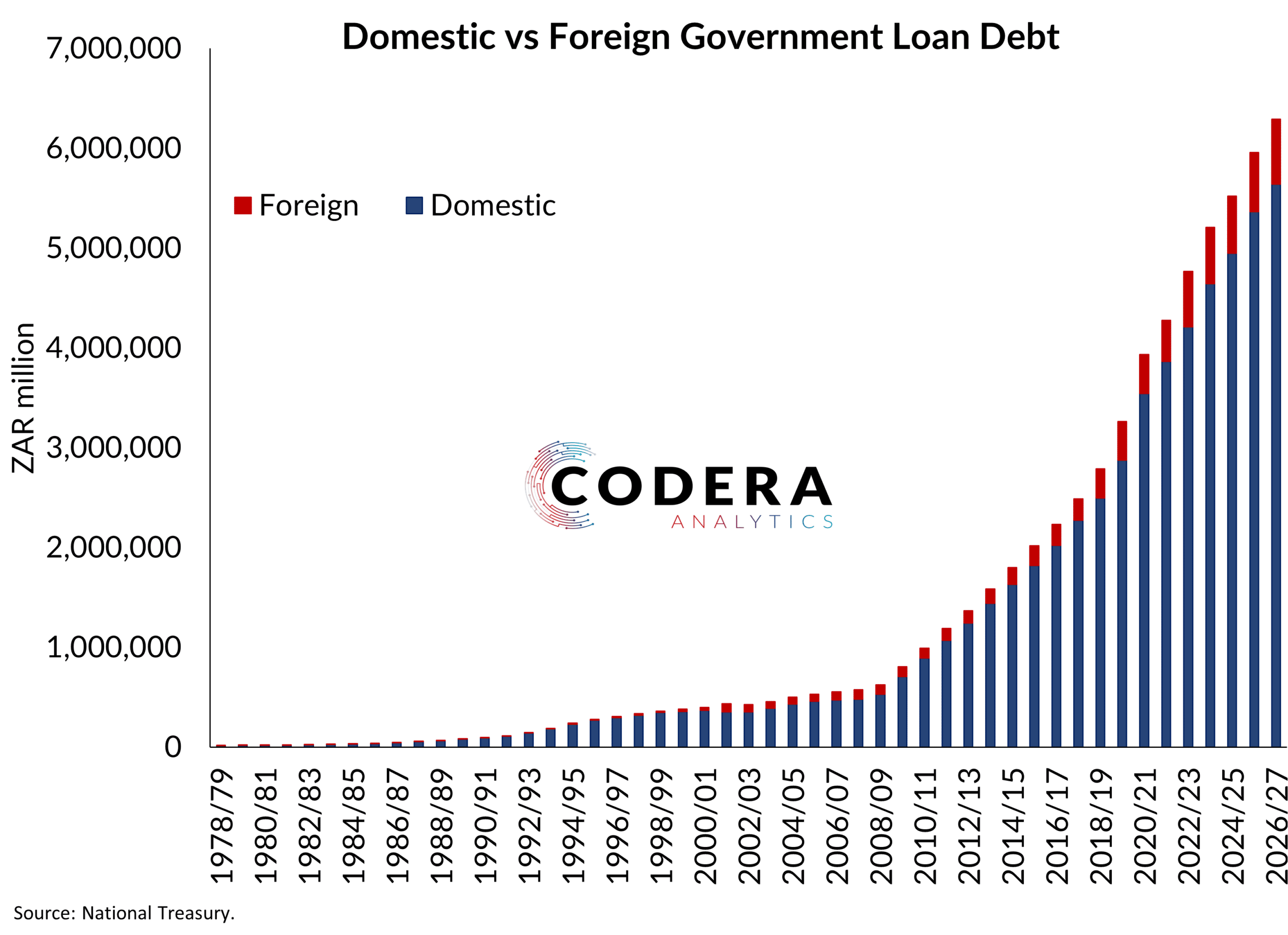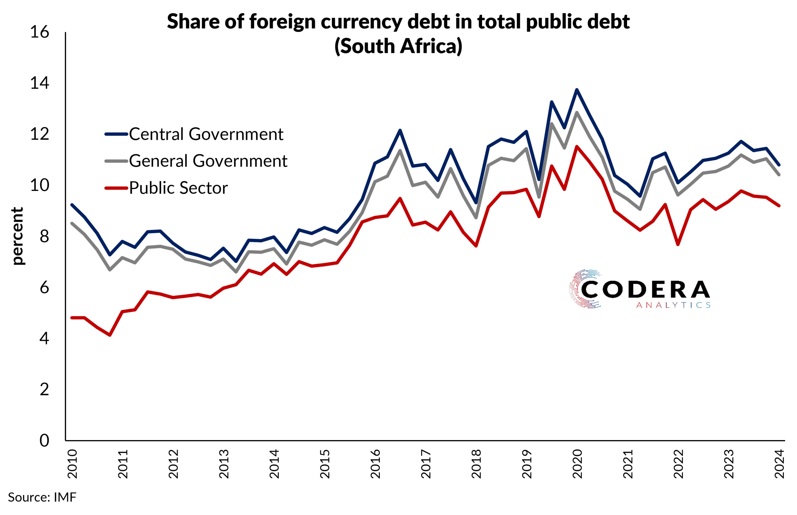 The ratio of foreign currency public debt to total is around 10%, see National Treasury and IMF figures below.