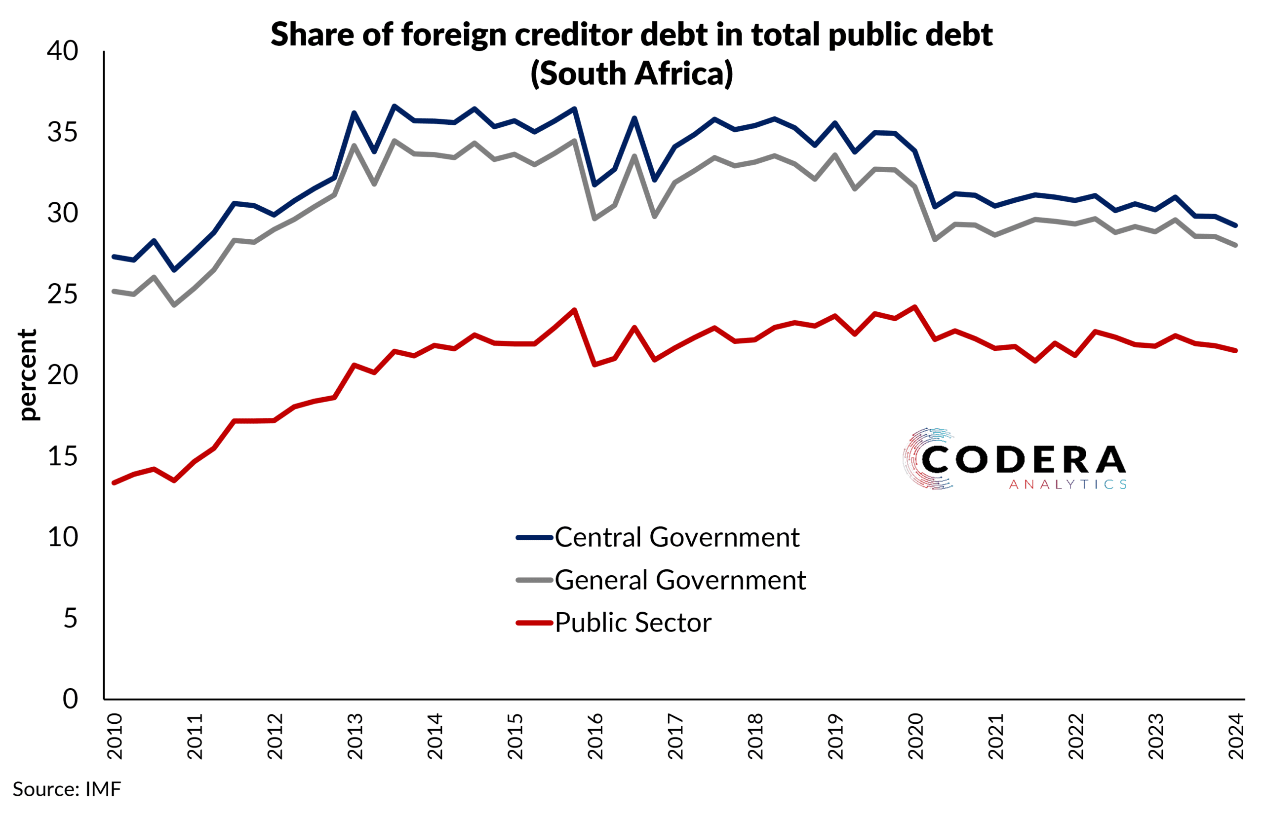 The ratio of South African public debt owed to foreigners relative to domestic creditor debt has been declining relative to its pre-COVID pandemic peak.