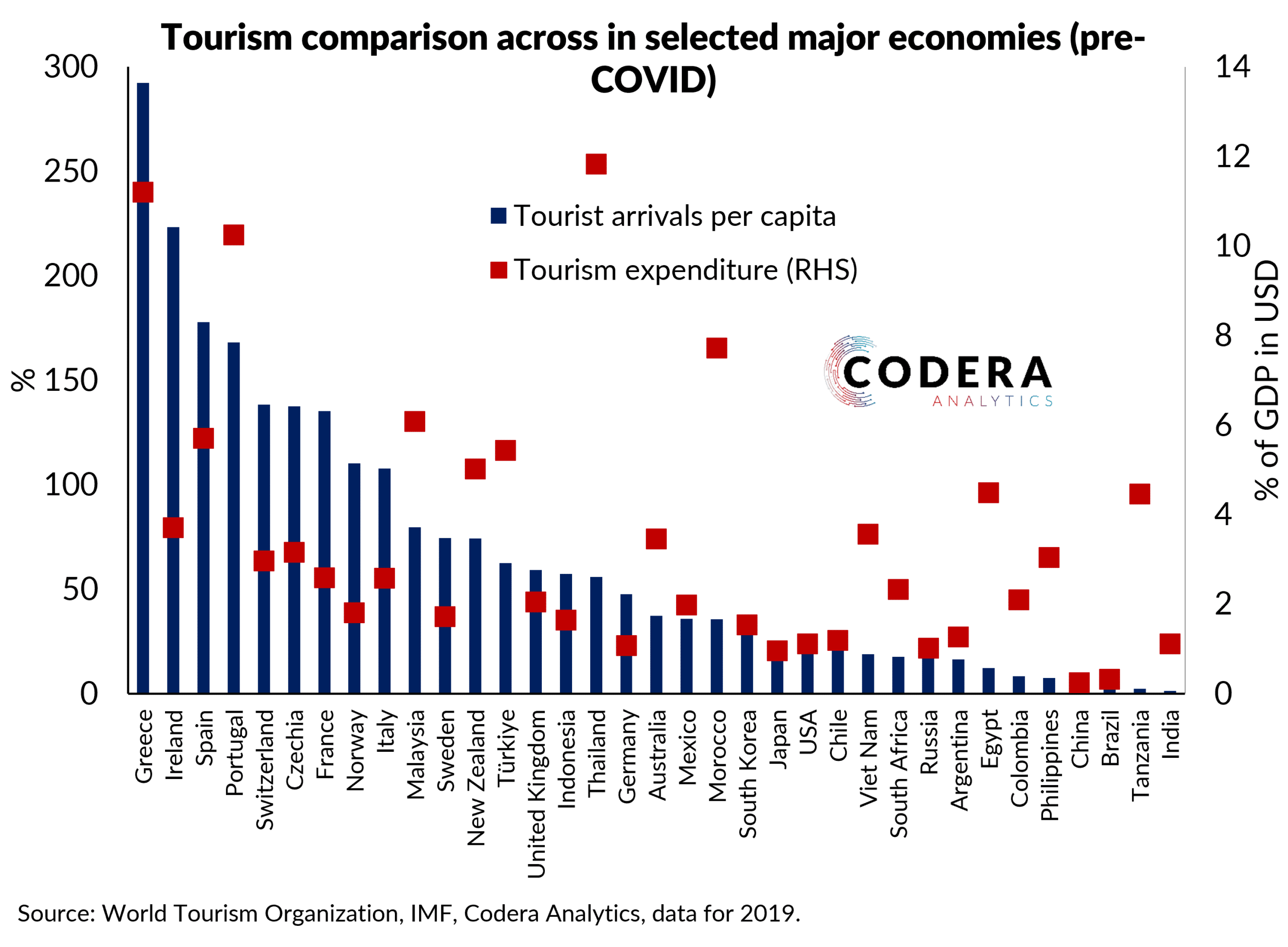 Although South Africa receives fewer tourists per capita than other major economies, tourism expenditure is estimated to be more important to the economy than in other major economies.