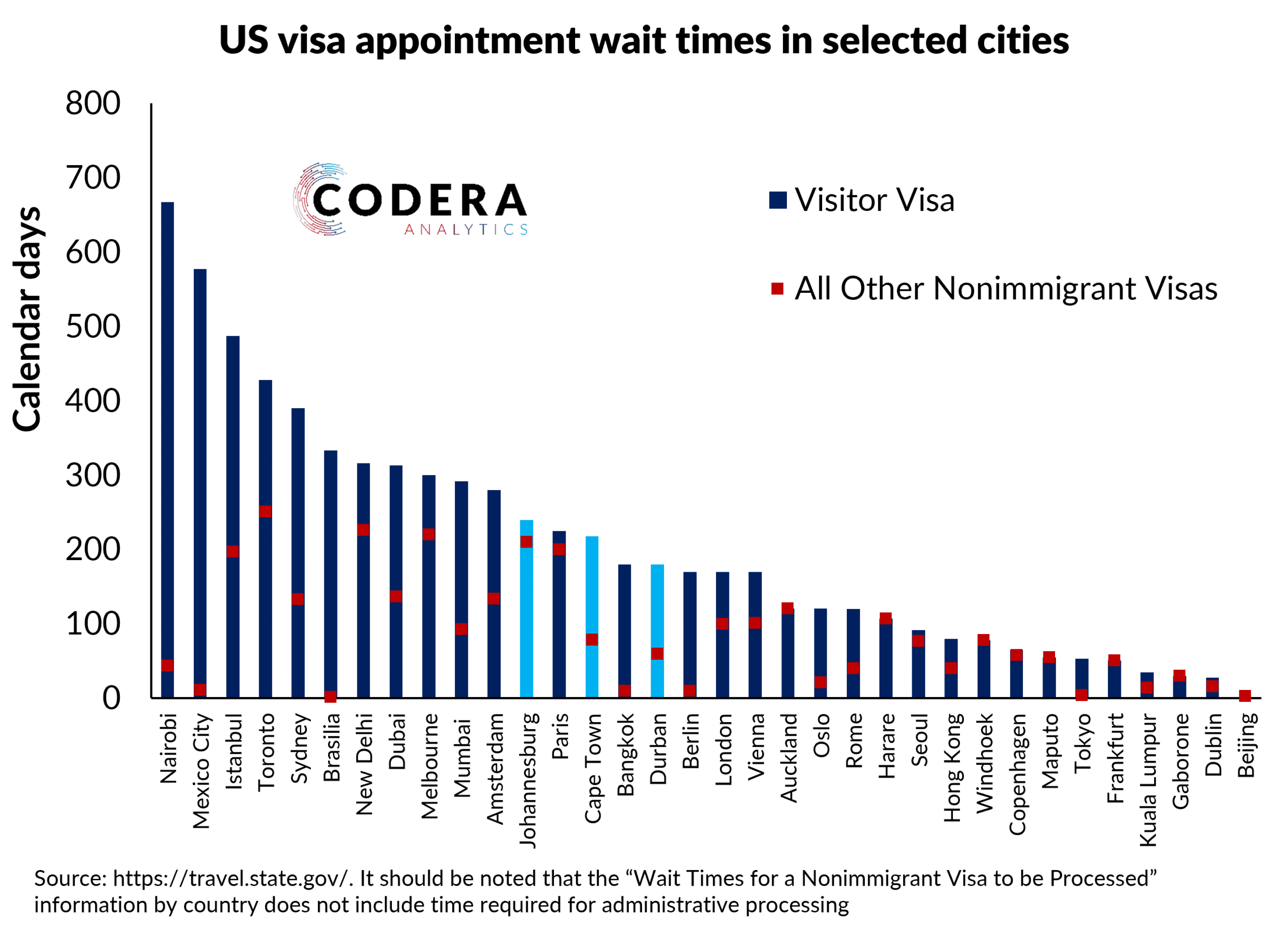 action or later. Please see Debugging in WordPress for more information. (This message was added in version 6.7.0.) in /home/coderaco/domains/randomsample.co.za/public_html/wp-includes/functions.php on line 6121It takes 240 days to get a visitor visa appointment for the US in Johannesburg (in Cape Town it is 218 days and Durban 180). Better to go to Maputo, where it takes 55 days.